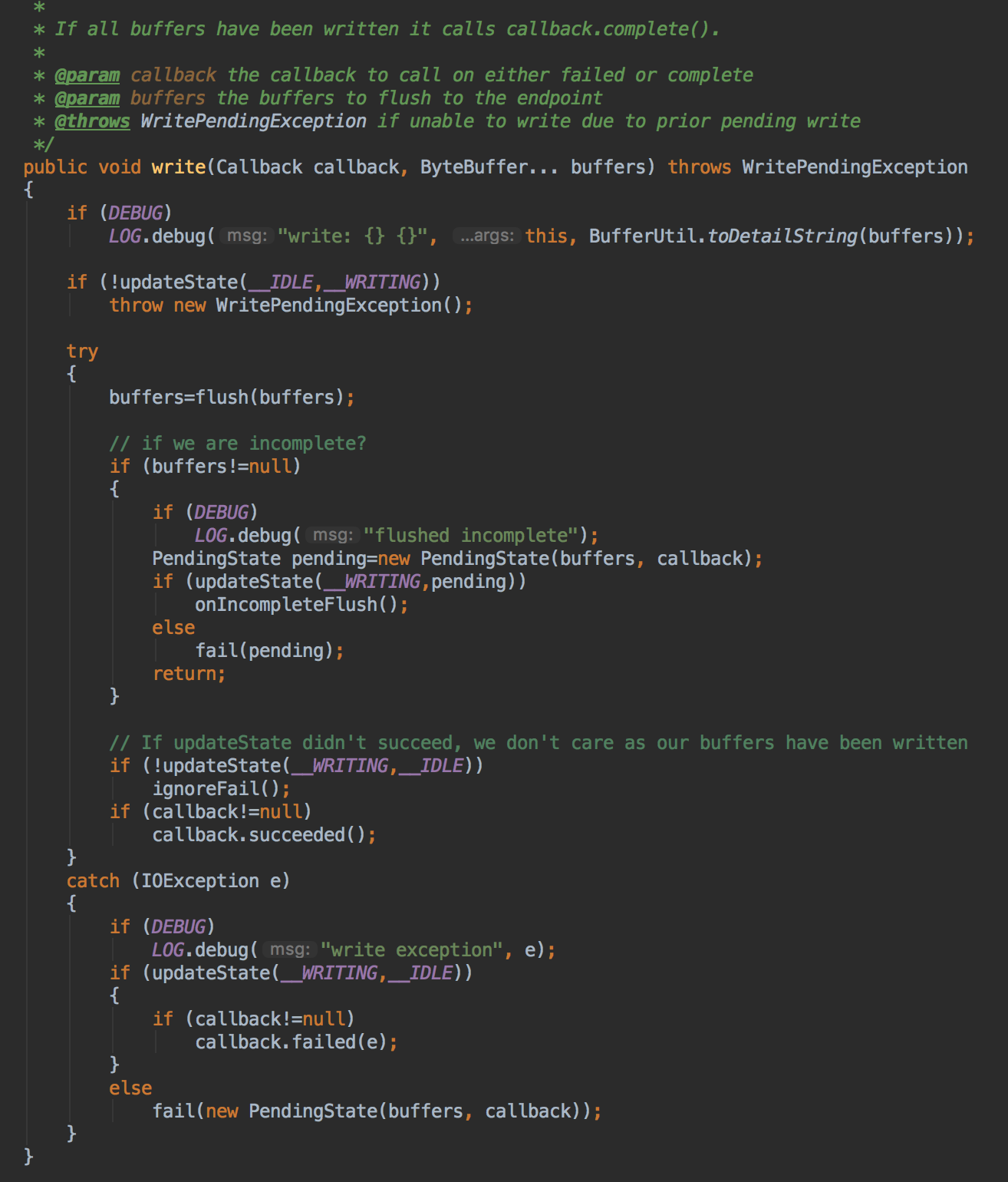 这里从之前存下来的PendingState拿出未完成的写,之前说到PendingState会记录未完成写入的Buffer数组,因此这里直接拿出来,调WriterFlusher.flush(上面已经讲解过了),如果仍然存在未完成的,那继续放到PendingState,等待下一次完成写入,否则就让PendingState.complete,其实就是调了callback.succeeded