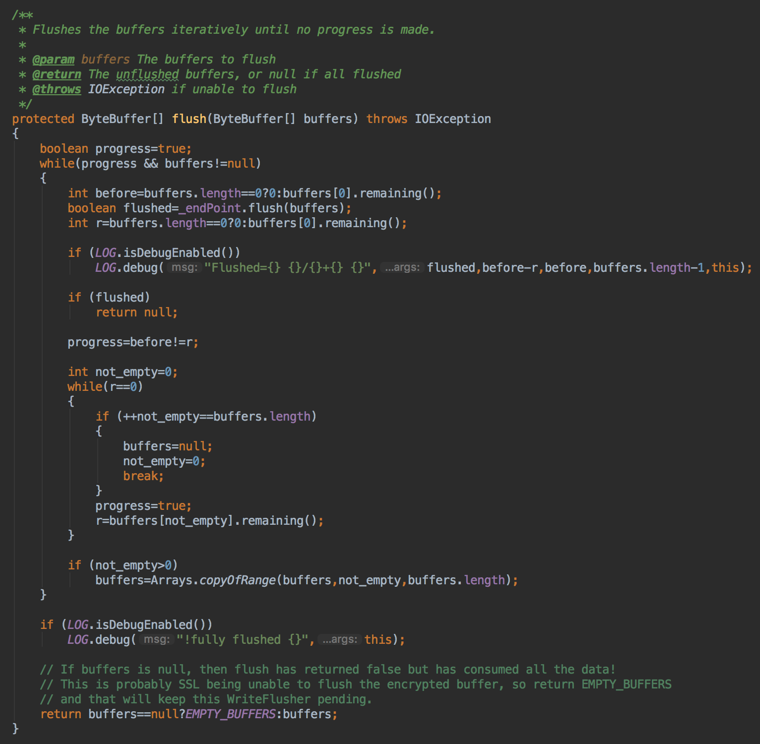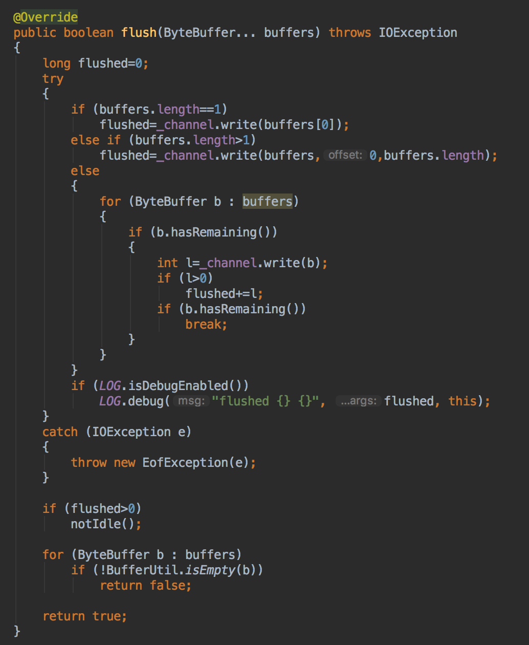 可以看到这里会调用EndPoint.flush来刷数据(下面会讲解它的实现),刷完后,会给出标识是否完成了,如果完成了,那这里就返回了,如果没完成,这里就会去把这些未完成的Buffer靠背到新的数组里面去,并返回给上一级调用