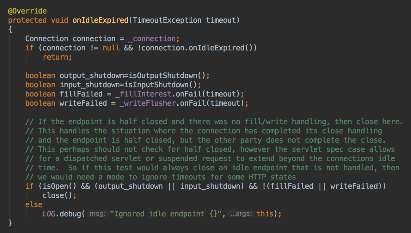 IdleTimeout的逻辑比较简单,就是定时器定时检测当前是否已经到了超时时间,如果超时了,则执行一个抽象的onIdleExpired方法,让业务层自己处理,在AbstractEndPoint里面就实现了这部分逻辑