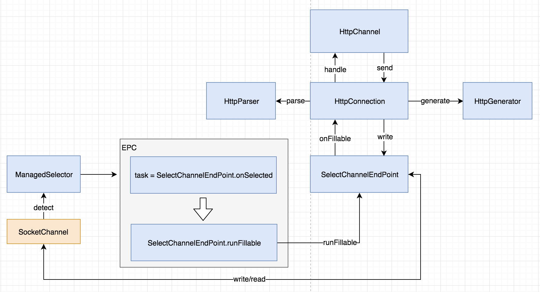当IO事件发生时,SelectChannelEndPoint在EPC的触发下首先执行onSelected,完成回调类型任务的选择,完成后返回一个任务,这个任务由EPC继续执行,调用到任务的run方法,这时候会触发之前EndPoint上关联的读或者写回调,从而调用到了HttpConnection.onFillable或者WriteFlusher的写操作,这样就能触发到后续的操作了
