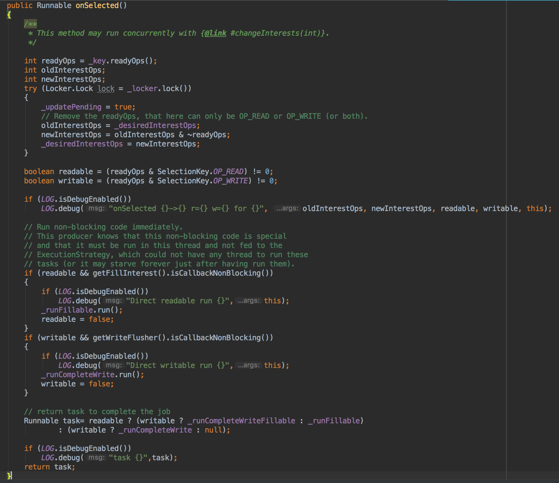 后面就检测当前是读还是写,然后根据读写事件类型拿到一个任务,可能是3种情况:只写、只读、读写,这个不难理解。但是有些读者可能会问,这里为啥要有写操作?其实对于NIO写操作来说,往Channel里面写数据不一定一次性能写完,在底层缓冲区满了的情况下,write操作可能会返回0,也就是一个都没写成功,如果while一直写入,CPU就打爆了,因此利用Selector来检测OP_WRITE操作,当可以写的时候尝试去写,这样保证CPU不会轻易飙升