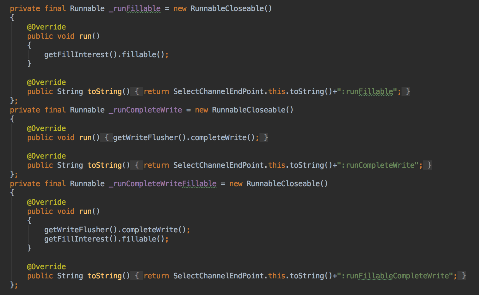 SelectChannelEndPoint主要封装EPC执行任务需要的接口,其实就是实现了ManagedSelector.SelectableEndPoint接口,后续IO事件发生时会触发这个EndPoint的onSelected方法,获取到待执行任务