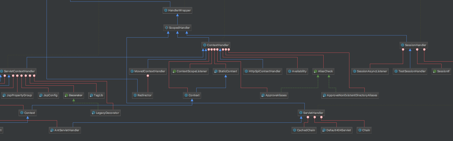 我们可以从继承体系看到ScopedHandler实际就是一个HandlerWrapper,子类有SessionHandler、ContextHandler、ServletHandler,同时它的类标记为abstract,所以可以看出ScopeHandler是一个半成品