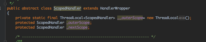 ScopedHandler用一个静态变量__outScope,类型为ThreadLocal,保存每个线程对应的顶端链节点。_outScope表示当前链的顶端链节点,_nextScope表示当前节点的下一个节点