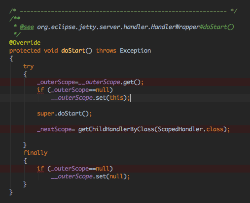 doStart:设置当前节点的顶级节点_outScope,然后调用父类的doStart,完成容器中孩子的启动,之后从当前handler的孩子里面查找ScopedHandler,将第一个孩子(注意getChildHandlerByClass其实是拿当前容器里面所有ScopedHandler类型的对象,通常第一个孩子肯定是我们前面设置的handler)设置为_nextScope。finally里面判断如果是顶端节点,则将该线程绑定的顶端节点设置回null,防止后续线程复用的情况出现错误的顶端链