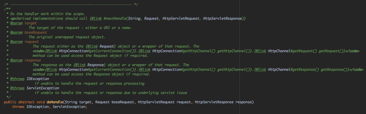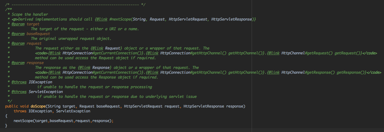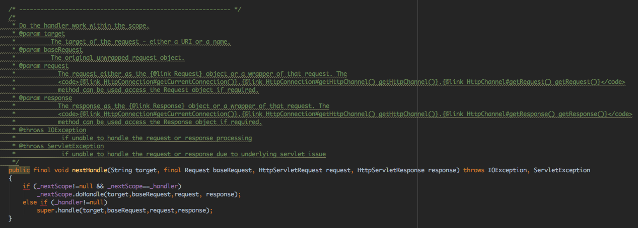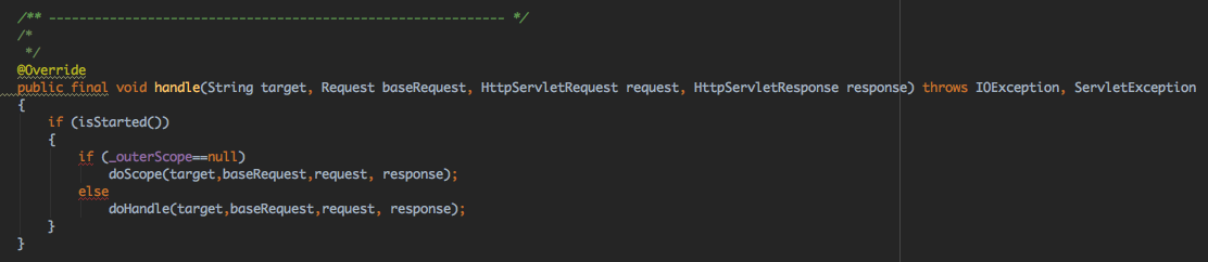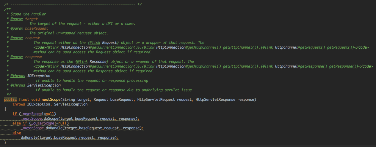 当A.handle时,会触发A.doScope,同时A的nextScope不是null,因此继续B.doScope,B的nextScope也不是null,因此执行C.doScope;此时C.nextScope是null,但outScope不是null,因此执行A.doHandle,由于A.nextScope不是null并且A.handler = B,所以执行B.doHandle;由于B.nextScope不是null,但B.nextScope是C,并不是之前设置的X,因此会直接执行HandlerWrapper的handle方法,这时会执行X.handle,X执行完成后,会执行自己的handler,也就是C,于是C.handle,由于C是ScopedHandler,同时C的outScope不是null,因此直接进入doHandle,C完成执行后发现nextScope为null,因此停止执行,这样其实就构建了ScopedHandler的注释里面提到的A、B、X、C链的处理逻辑,
