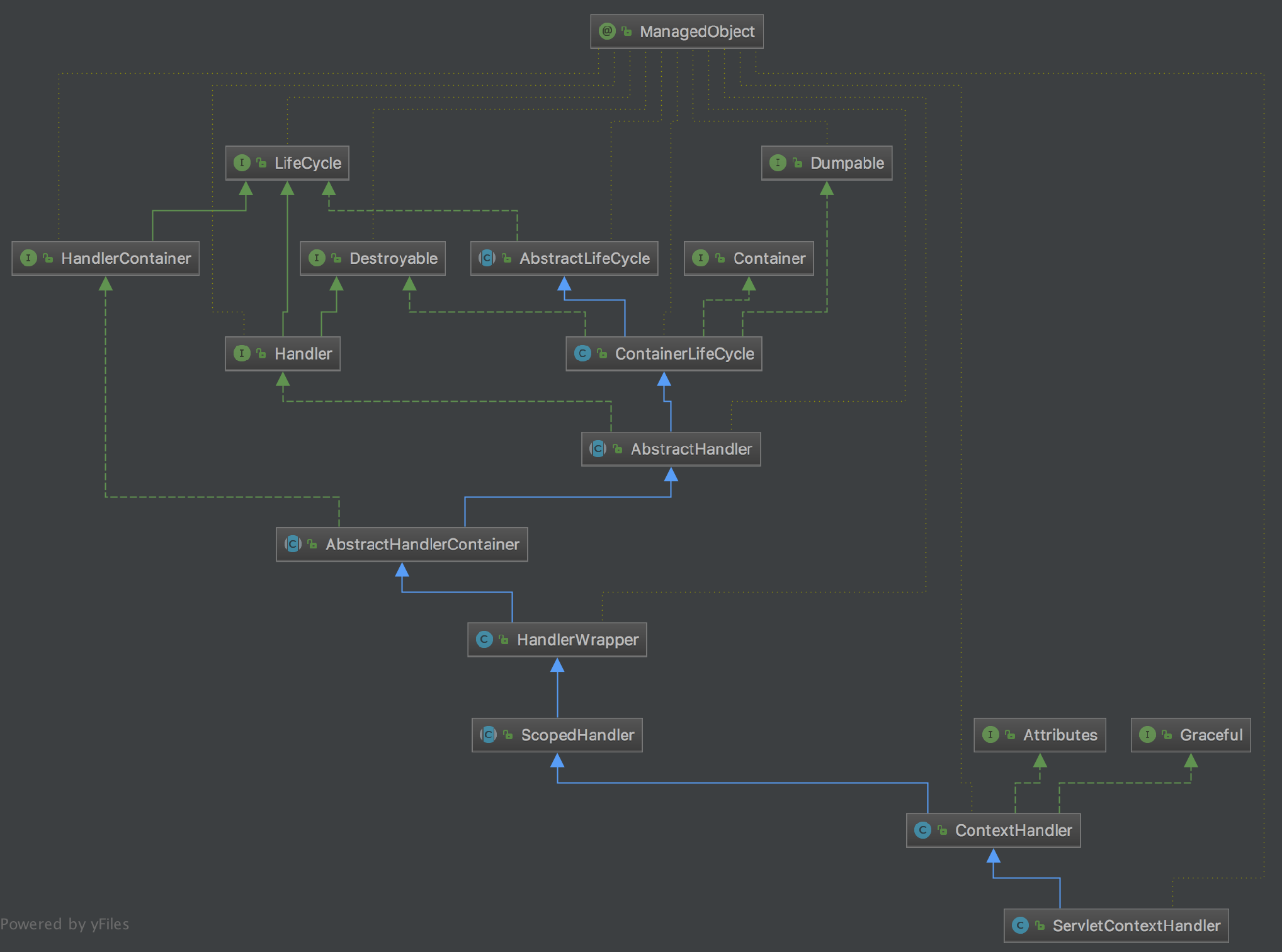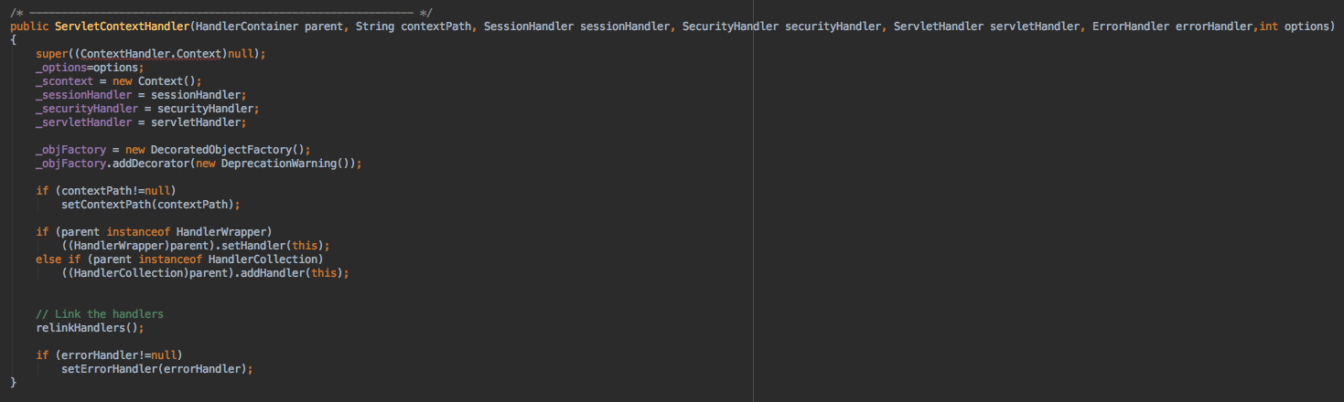 ServletContextHandler是Handler体系的重要成员,它包装常用的SessionHandler、ServletHandler、SecurityHandler,自身同时是一个ContextHandler,集成四大Handler,形成一个接近完整J2EE的处理器(这里对war的处理还未实现)