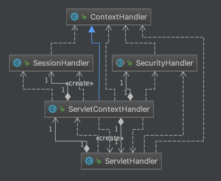 ServletContextHandler会集成SessionHandler、ServletHandler、SecurityHandler,会根据配置主动创建,而自身是一个ContextHandler,因此可以说它是具备4大组件的一个Handler
