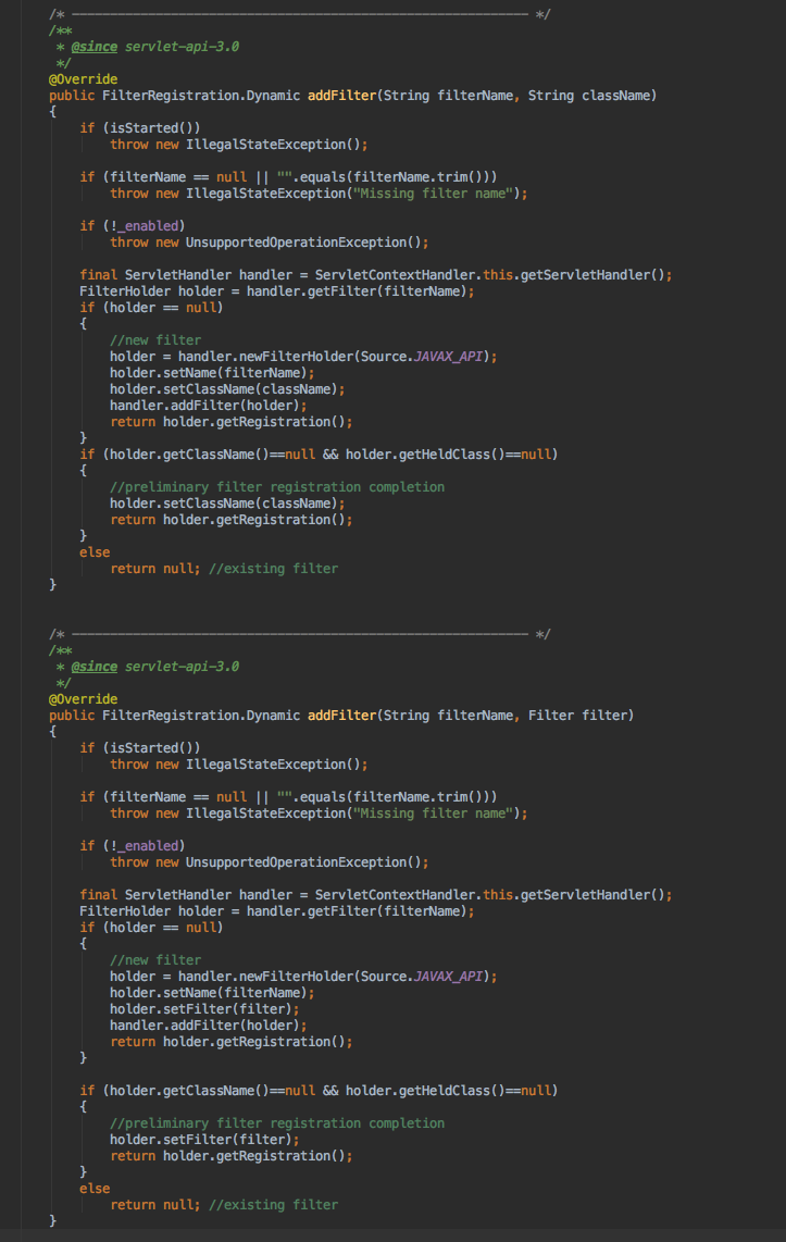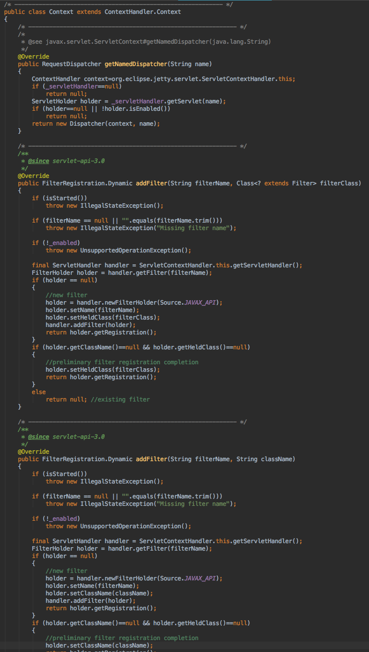 ServletContextHandler作为一个半成熟的处理器,主要对外包装很多接口,例如添加Filter、添加Servlet、安全相关,实现上没什么特别的。后面我们会研究WebAppContext这个处理器,它是最核心的一个Handler,实现了完整的Web服务需要的逻辑,特别是类加载器,到时候我们一起来学习下~