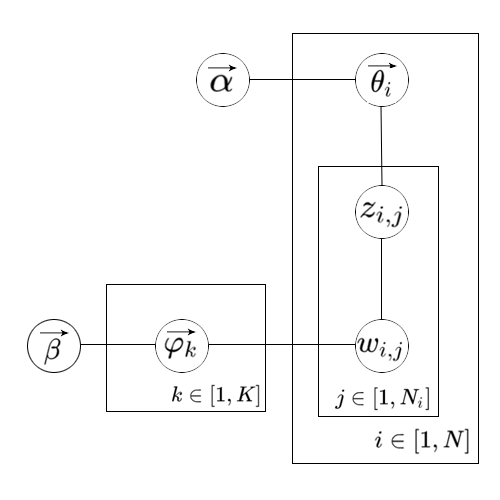 LDA的概率图模型见下图。箭头定义了随机变量间的关系。每个方框定义了每个过程,方框右下角的变量是该过程的重复次数。