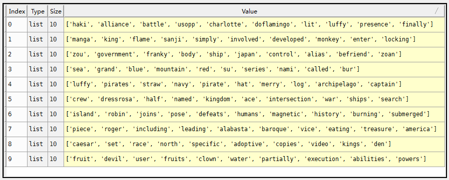 | 第i篇文档的第j个单词在词表中的编号 | docs[i,j] | docs是一个元素为list的list | |