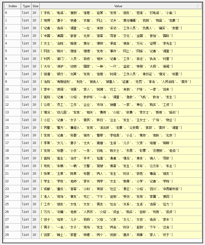 实验结果如下图。给出了每个主题top10的词语。