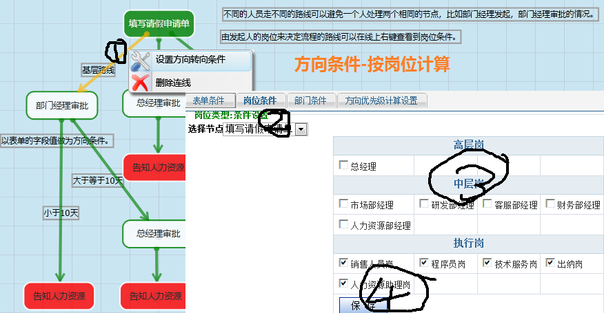 说明:上图中一个请假流程,不同岗位的人员所走的请假路线是不同的。只要当前的操作员具有该岗位这条路线对它来说是通的。