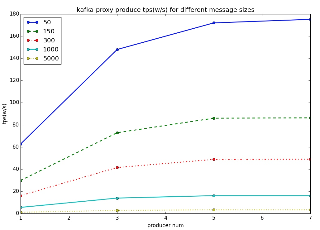 笔者用一台物理机部署Kafka Broker作为Proxy,同时用另一台同样配置的物理机部署RocketMQ作为存储,然后用另一台物理机来对Proxy进行施加压力,结果如下图: