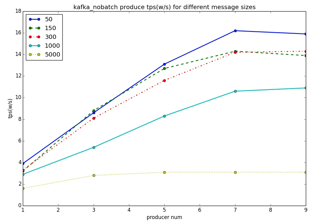 上图可以清晰地看出,50字节时,Kafka no batch(batch size设为1)时的吞吐量只有15万多,只有启用batch时的十分之一,而RocketMQ也可以很轻松地达到这个水平。