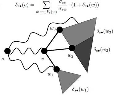 对于t!=w的情况,σst(w)/σst表示节点w在两节点s,t之间的某条最短路径上,同时σsv/σsw表示该路径是通过节点v到达的节点w,所以(σsv/σsw)*( σst(w)/σst)表示的是节点w跟其前哨节点v都在两节点s,t之间的某条最短路径上。根据以上两式我们得到: