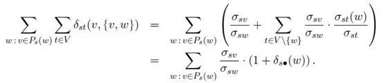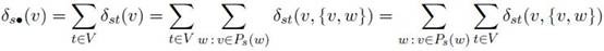 其中可能较难理解的是第二个等号,我的理解是若节点v在两节点s,t之间的某条最短路径上,那么一定存在节点w使v∈Ps(w),当然有可能w就是t。同时我们可以得到: