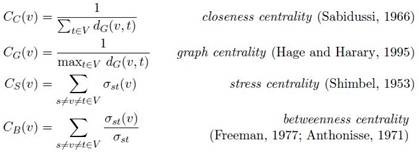 可以看到,closeness centrality考虑的是该节点到其他各节点最短路径的长度之和;graph centrality考虑的是该节点到离自己最远的节点的最短路径的长度;stress centrality考虑的是该节点出现在其他两节点之间的最短路径上的次数;而本文讨论的betweenness centrality考虑的是该节点出现在其他两节点之间的最短路径上的比率。
