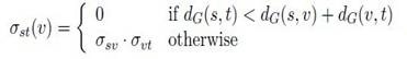 定理:节点v出现在了节点s、t之间的某条最短路径上当且仅当dG(s,t) = dG(s,v) + dG(v,t)