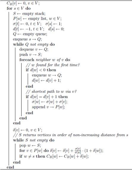 Betweenness Centrality 计算的详细介绍参见《A Faster Algorithm for Betweenness Centrality》,上述伪代码的Python实现参见 BetweennessCentrality.py。