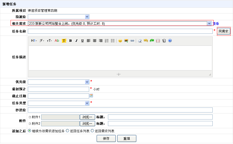- 如果需求和任务的标题是一样的,可以通过”同需求“按钮快捷的复制需求的标题。
