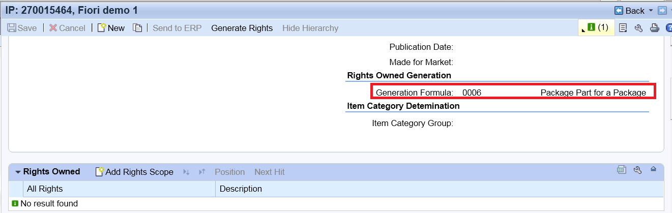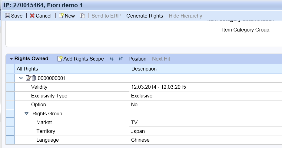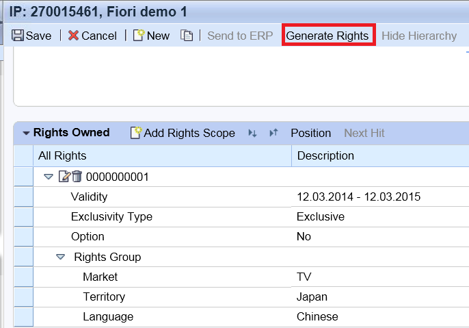 点Generate Rights button,Acquisition contract里的right scope除了transmission number 之外的其他信息都会自动同步到Package IP product里: