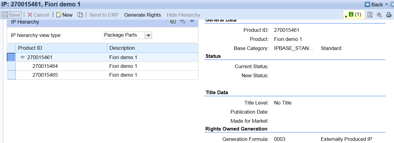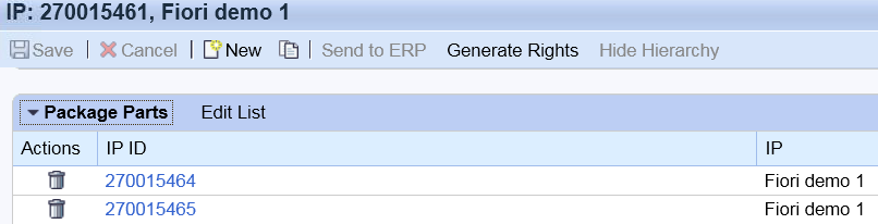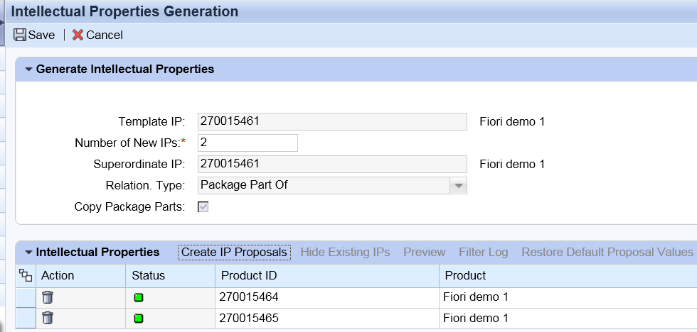 维护template IP和Superordinate IP,指定需要生成的IP product的个数和relationship type, 下图将为IP 270015461 生成两个子IP products, 自己作为Package来包含这两个子IP.