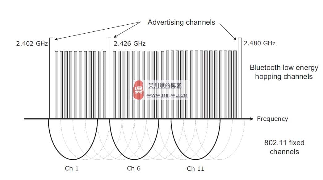 - Bluetooth Smart:40个信道,信道索引为0 ~ 39,覆盖范围为2400 ~ 2483.5MHz,其中信道37、38和39为广播信道。
