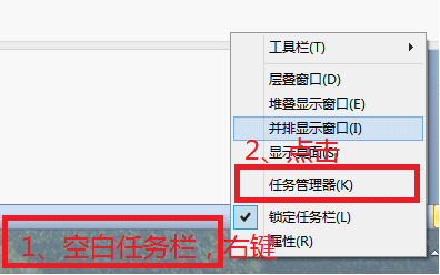 打开“任务管理器”的方法有很多种,一种是Ctrl+Alt+Del按键,然后用鼠标选择“任务管理器”;另一种是在任务栏空白处点鼠标右键,再选择“任务管理器”