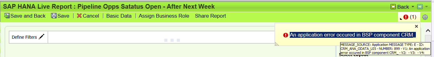 Error message: An application error occured in BSP component message id:CRM_ANA_ODATA_UI5, number 899