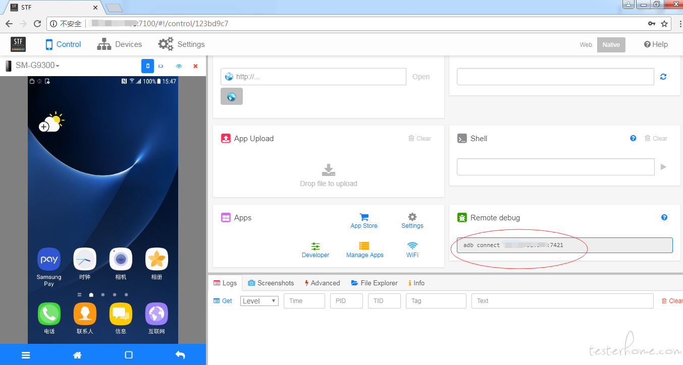 1.登录进入到stf页面后,在真机调试界面,有一个瓢虫一样的图标,复制adb connect xxxx命令