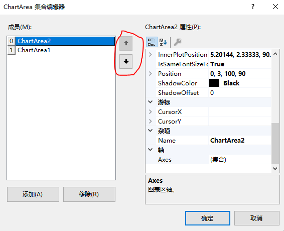 各位大神,我在做一个Chart图表时,使用了2个叠加在一起的ChartArea,如图所示。我可以在ChartArea集合编辑器中通过上下箭头调整每个ChartArea的顺序,请问这个操作如何在代码端实现?