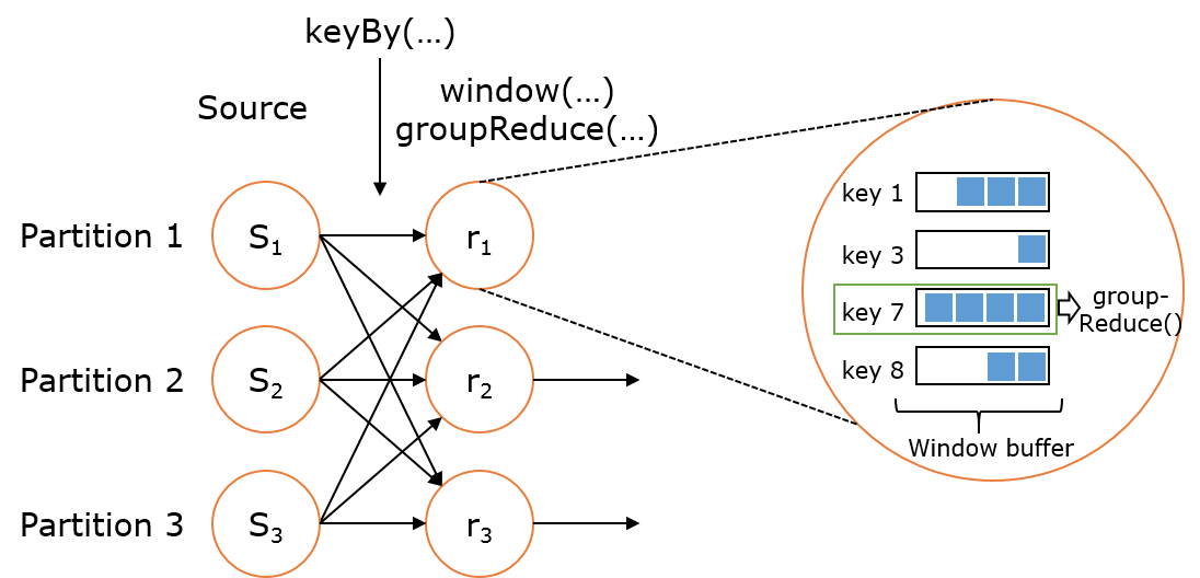 val stream: DataStream[MyType] = ... val windowed: WindowedDataStream[MyType] = stream .keyBy("userId") .window(TumblingEventTimeWindows.of(Time.seconds(5))) // Last 5 seconds of data val result: DataStream[ResultType] = windowed.reduce(myReducer) |