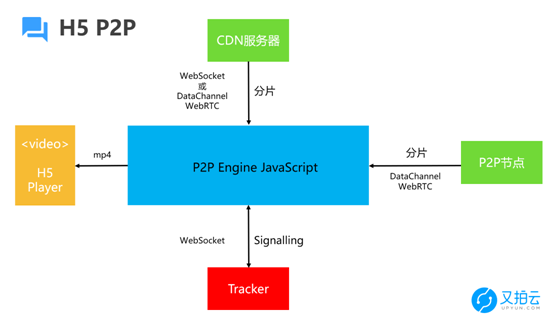 H5P2P 用 JavaScript 实现 P2P 引擎,包括下载器、转封装。通过 WebRTC 里面的 DataChannel 功能建立 P2P 连接,从 P2P 雾节点拿数据;当 P2P 数据不足时,可以通过 WebSocket 或者 DataChannel 去 CDN 补数据;将 P2P 数据与 CDN 数据组合后得到完整的媒体数据;最后通过 MSE 转封装成 mp4 向 H5 播放器 (video标签) 提供媒体数据流。