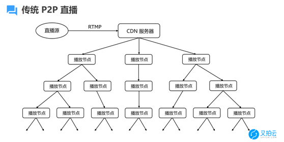 当播放人数变多,P2P 直播的节点层级也变得很大,最多时会有十几层。这导致它的延时非常大,少则 30 秒,多则达到几分钟的延迟。这种延时水平,在目前的游戏直播、秀场直播等直播应用场景里面是无法应用的。