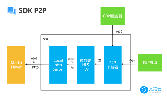 我们在 SDK 里面做一些本地的转封装之后,然后通过 local(127.0.0.1) 的 HTTP Server 向播放器提供标准的 HTTP 请求,比如说 HLS 、HTTPFLV。在使用传统 CDN 服务时,播放器发起一个 HTTP 请求或者 RTMP 请求到 CDN,现在使用 SDK P2P CDN 服务后,播放器直接到本地地址(127.0.0.1)拉取一个 HTTP 请求。播放器只需要改变一下请求的 URL 就可以从传统 CDN 切换到 SDKP2P CDN。