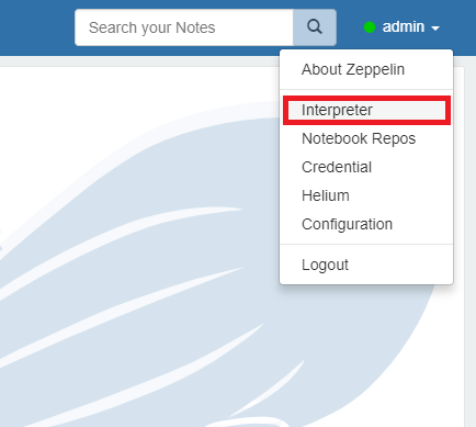 可以配置笔记本和Zeppelin Spark 解释器,以使用Spark来获得更多的处理能力。如果本地Spark实例的计算能力不足,这将非常有用。你可以通过右上角的用户名下拉菜单访问解释器设置,如下图所示。
