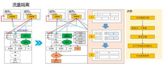 流量隔离是把整个集群从原来在线的集群,比较快地通过负载均衡隔离出一个集群出来。当然隔离出的集群规模是非常大的,它可以占原来集群的从90%到10%。比如原来有10万台服务器,可以隔离到9万台服务器。因为准备做大促的时候,比如双十一的流量是平时的20倍以上,所以平时流量非常低是可以隔离出来的,并且不会影响现有的流量。