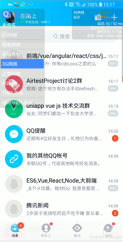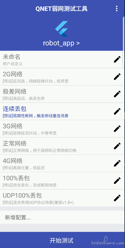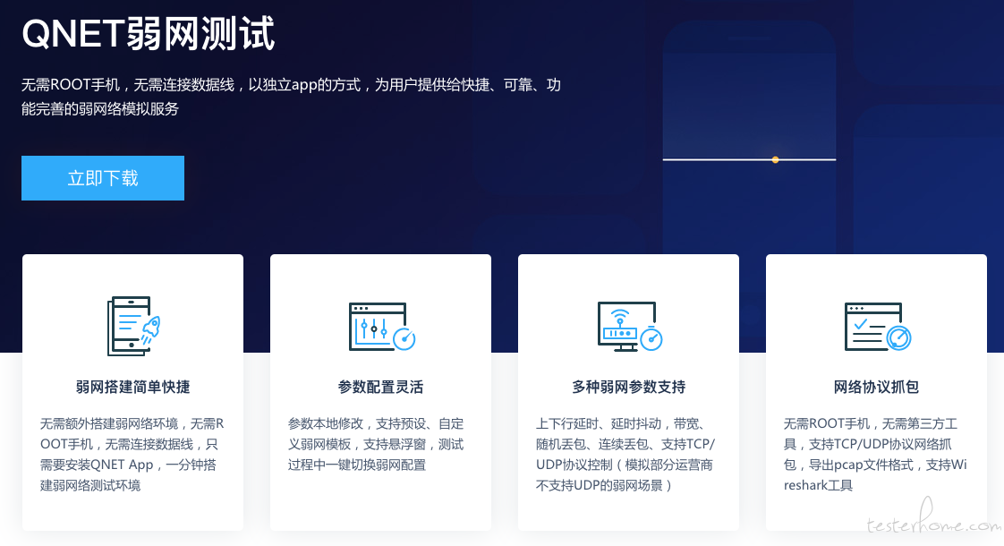 最近在找稳定的弱网测试工具,偶然发现腾讯竟然有一款:QNET弱网测试工具 使用方法很简答:下载QNET APP安装,用QQ登陆后,即可开始。 可用的弱网环境: 自定义弱网环境: 实际使用情况: 左边工具栏可随意切换网络环境,一般大约3秒左右就会切换成功; 右边工具栏实时显示网络情况; 还可以自动抓包 下载方式: 应用宝搜索下载 相关文章: