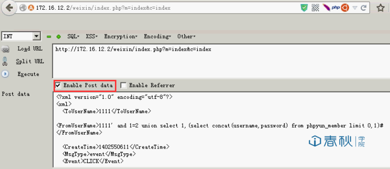 这个时候已经是登录状态,我们按F9 调出 Hack Bar 的界面,点击Enable Post data ,将Payload写入输入框,如下图所示: