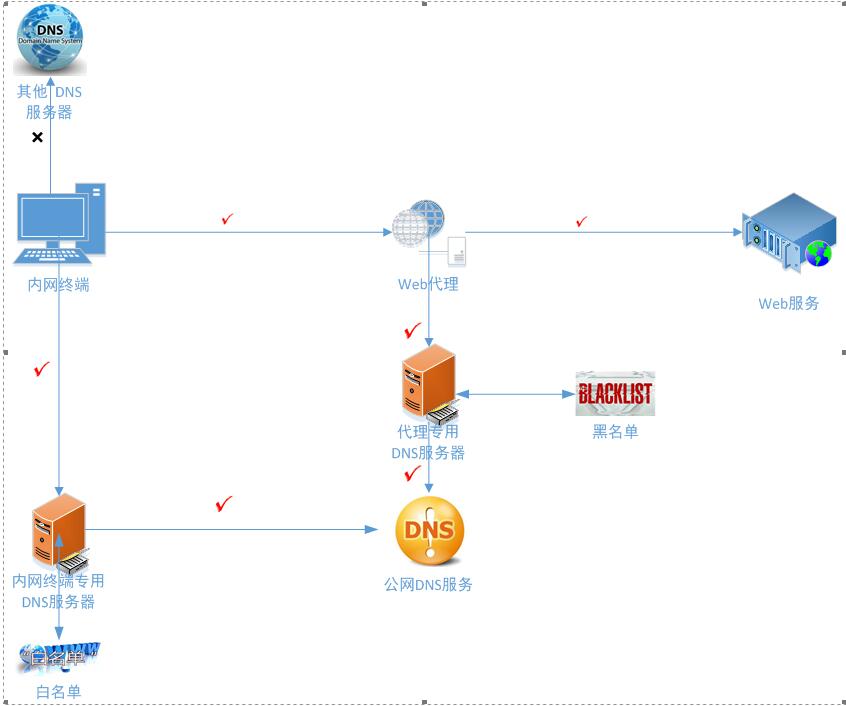 代理专用dns服务器:给web代理提供dns服务器,不提供黑名单解析,降低恶意web业务访问