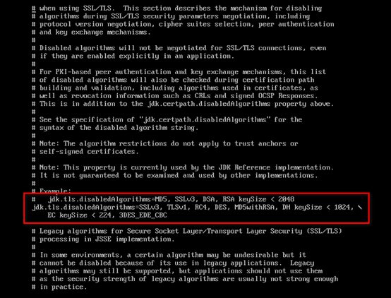 jdk.tls.disabledAlgorithms=SSLv3,RC4, DES, MD5withRSA, DH keySize < 1024, \EC keySize <224, 3DES_EDE_CBC