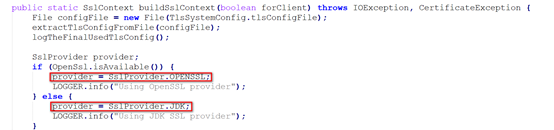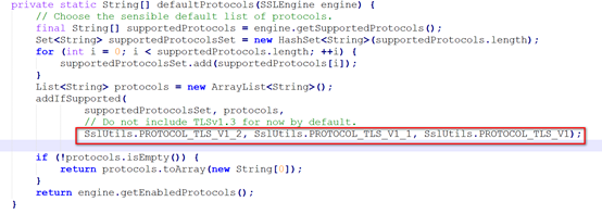 虽然解决了问题,但始终觉得RocketMQ应该提供一个更为直观的配置方式,怀着疑问和好奇简单地走读了一下RocketMQ的源代码(RocketMQ为开源软件,其核心组件为jboss netty开源组件),发现在netty中硬编码写死了支持TLSv1.0,TLSv1.1,TLSv1.2,所以接下来的解决方案应该不用我说了。该方案也测试通过,可成功禁用。