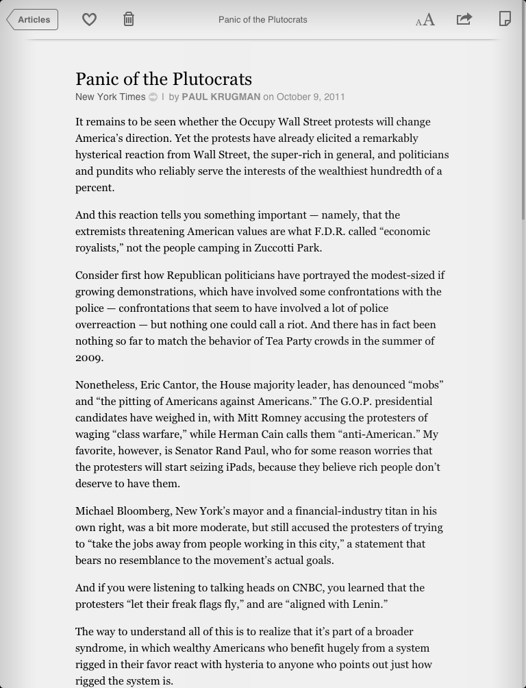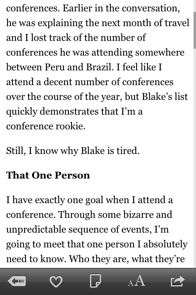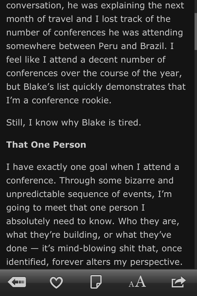 适合于在晚上阅读的黑底模式的夜晚模式效果更好。在iOS 5中,Instapaper可以支持真正的硬件亮度控制(这也是在iPhone版本首次出现可调亮度):