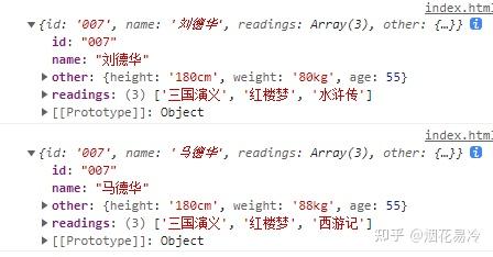 var p = { id: "007", name:"刘德华", readings: new Array("三国演义","红楼梦","水浒传"), other:{ height:\'180cm\', weight:\'80kg\', age:55 } } let newP = JSON.parse(JSON.stringify(p)); newP.name = \'马德华\'; newP.readings[2] = \'西游记\'; newP.other.weight = \'88kg\' console.log(p); console.log(newP)