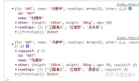 Array.prototype.copyself = function(){ let arr = new Array() ; for(let i in this){ arr[i]= this[i] } return arr; } Object.prototype.copyself = function() { let obj = new Object(); for(let i in this) { obj[i] = this[i] } return obj; } var p = { id: "007", name:"刘德华", readings: new Array("三国演义","红楼梦","水浒传"), other:{ height:\'180cm\', weight:\'80kg\', age:55 } } function copyOjb(obj) { let newObj = {}; for(let i in obj) { if(typeof obj[i]==\'object\') { newObj[i] = obj[i].copyself(); } else { newObj[i] = obj[i]; } } return newObj; } var newP = copyOjb(p); newP.name = \'马德华\'; newP.readings[2] = \'西游记\'; newP.other.weight = \'88kg\' console.log(p); console.log(newP)