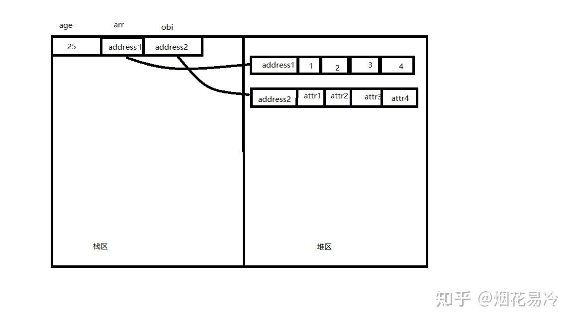 在上述函数中,age是基本类型,arr和obj是引用类型。age的名称和值都在栈区,arr和obj的名称在栈区,值却在堆区,在栈区只保留了一个堆区的相关地址。
