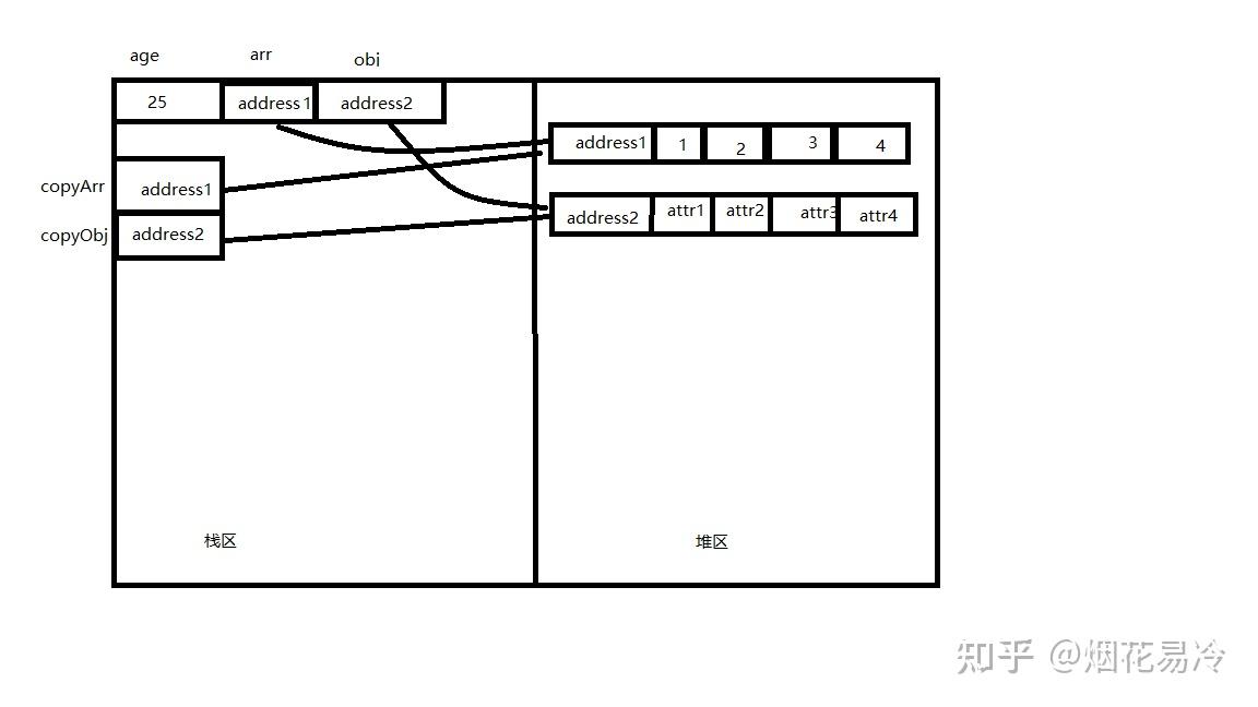 var age = 25; var arr = [1,2,3,4]; var obj = { attr1:1, attr2:2, attr3:3, attr4:4 } var copyArr = arr; var copyObj = obj;