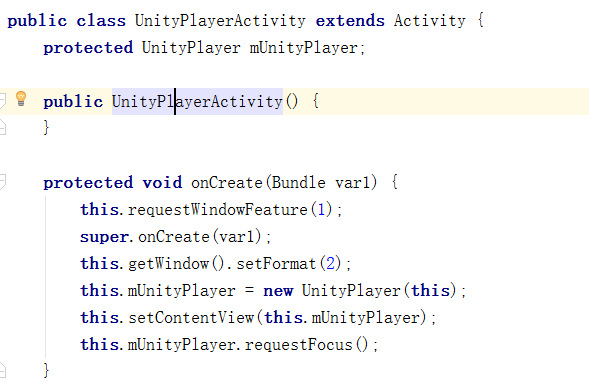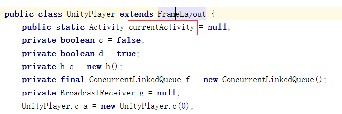 上面代码第一种先获得UnityPlayer类,UnityPlayer类是unity导出Android工程后生成的unity-classes.jar里的类。然后再获取静态变量_mActivity,_mActivity 是Activity类型,由此获得了Android当前的Activity,然后再调用此Activity中的方法。我们可以看一下unity自动生成的classes.jar中的源码: