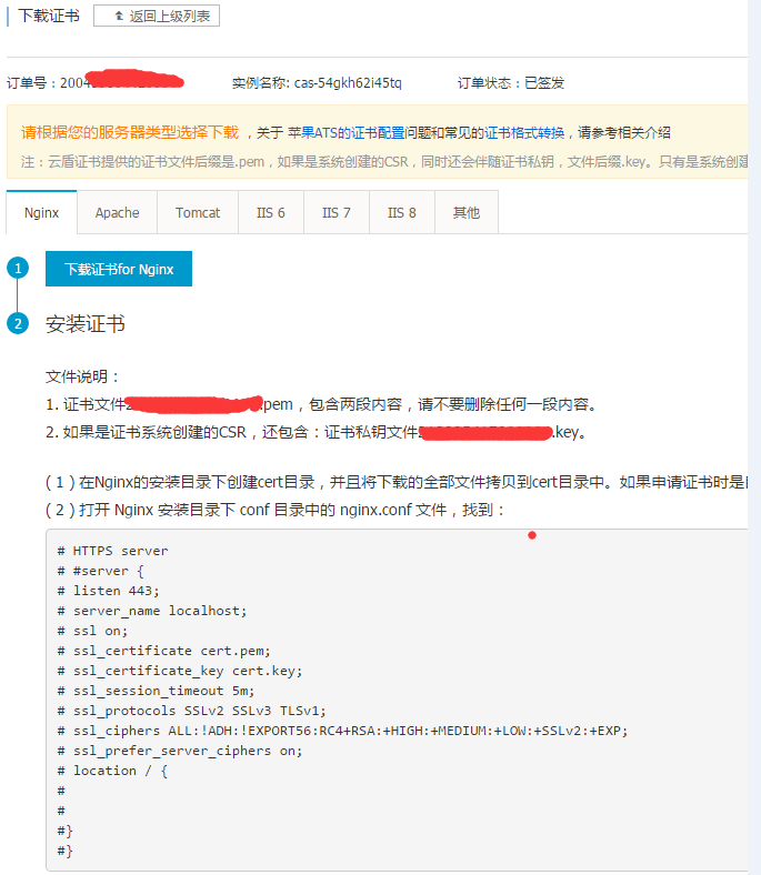使用阿里云SSL免费证书,并在服务器中启动SSL功能